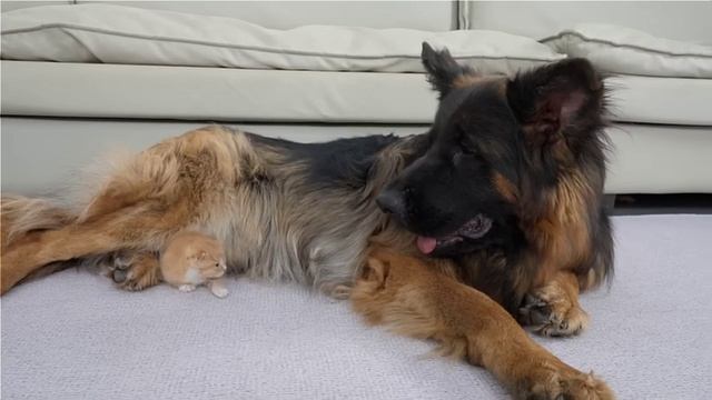 немецкая овчарка нашла на улице брошенного котёнка и теперь она стала его лучшим другом