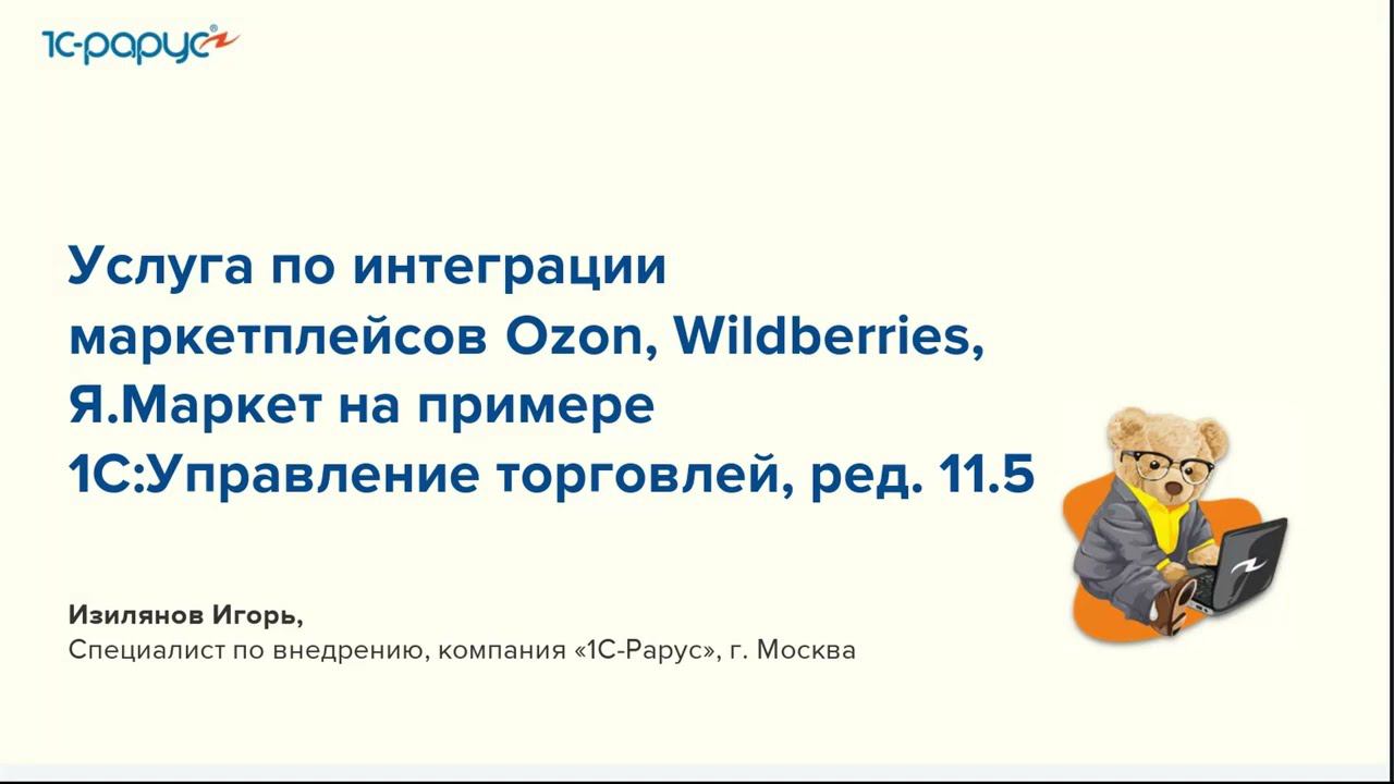 Запись вебинара от 6 июня 2024 года на тему "Вариант интеграции маркетплейсов Ozon, WildBerries, ЯМаркет с 1С:Управление торговлей, ред. 11.5". Программа вебинара: Что такое маркетплейсы. - Виды маркетплейсов: Ozon, WB, Yandex.Market. Особенности ведения продаж на площадках: схемы продаж, комиссии, отгрузка. - Ozon. - WB. - Yandex.Market. Комиссионная торговля в УТ11.5 - Какие документы для ведения продаж. - Отчеты комиссионеров. - Работы с маркировкой «Честный знак» и ТСД. Демонстрация функционала. - Примеры отчетов. - Примеры форм для работы.