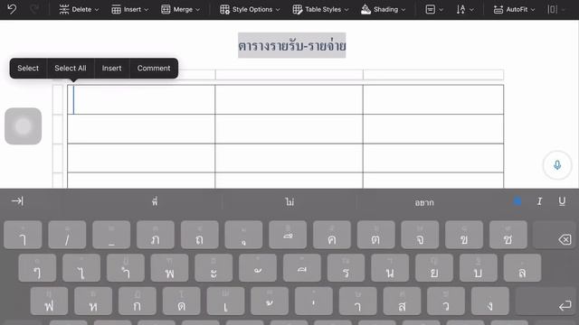 ตารางรายรับรายจ่าย Microsoft word ใน iPad