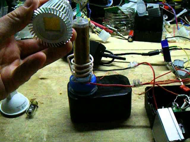 Качер намотан на шприце 20 мл, 495 витков проводом 0,1. Напряжение питания 24 вольта. Светодиодные лампы на напряжение 12 вольт, 6 Вт и 3,2 Вт.