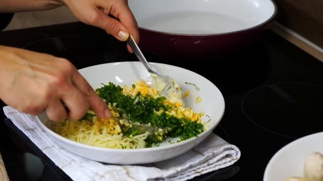 Рецепт: Яйца 4 шт Соль Сахар 2-3 ст. ложки Молоко 1 литр Мука 350 Растительное масло 50 мл Начинка: Грибы 400 гр Лук 4 шт Яйца отварные 2 шт Сыр 30 гр Майонез и зелень