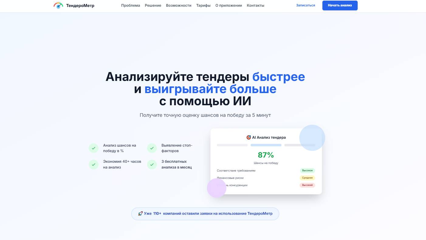 ПО ТендероМетр предназначено для автоматизированного анализа государственных и коммерческих тендеров с использованием искусственного интеллекта. Программа может использоваться в компаниях и организациях для повышения эффективности участия в тендерных процедурах. Описание функций, выполняемых ПО: · загрузка и анализ тендерной документации в ZIP архиве до 50мб; · AI-анализ с оценкой шансов на победу в тендере; · персонализированные рекомендации по участию; · выявление рисков и возможностей для каждого тендера; · управление профилем компании и проектами; · статистика и dashboard проанализированных тендеров. Ссылка на приложение: https://tenderometr.ru/