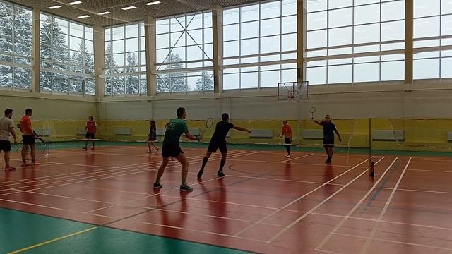Тренировочная игра в бадминтон через сетку. Играют любители, новички и опытные бадминтонисты. Игра на сборах в доме отдыха Снегири от клуба Искра 6-8 декабря 2024 #badminton #badmintonlovers #badmintonrussia #бадминтон #искра #iskra #snegiri #снегири