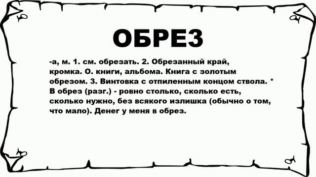 Хочешь знать что значит ОБРЕ3? тогда слушай до конца. #n #n -а, м. 1. см. обрезать. 2. Обрезанный край, кромка. О. книги, альбома. Книга с золотым обрезом. 3. Винтовка с отпиленным концом ствола. * В обрез (разг.) - ровно столько, сколько есть, сколько нужно, без всякого излишка (обычно о том, что мало). Денег у меня в обрез. #n #n Больше слов: #слова #словарьрусский #значениеслов