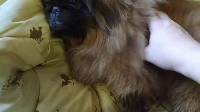 Пекинес Дендик капает одеяло