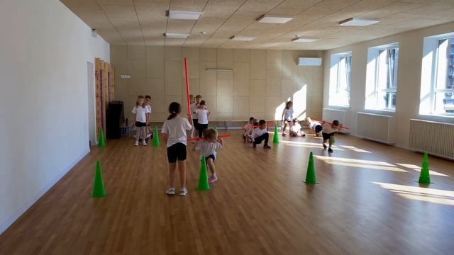 Весела та активна естафета з гімнастичними палицями! Гравці стрибають двома ногами, тримаючи палицю за спиною, від фішки до фішки. Після проходження дистанції учасник передає палицю наступному гравцю. Енергійна командна гра, що розвиває координацію, силу і командний дух! Готові до нових стрибкових пригод?