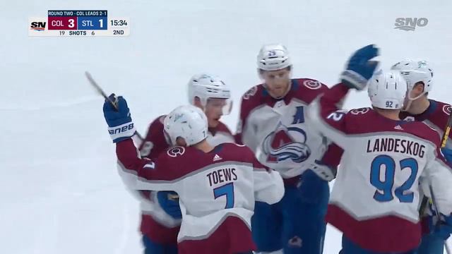 Watch as Colorado Avalanche forward Nazem Kadri scores at 15:53 of the second period to give his team the lead and is quickly followed by another goal from defenceman Devon Toews just 19 seconds later against the St. Louis Blues in Game 4.
