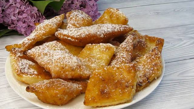 Простой и лёгкий рецепт! Нравится то, что из маленького кусочка теста получается гора вкусного хвороста, всеми любимого с детства. Горячий - он мягкий, на следующий день - хрустящий. С чаем, молоком, мёдом вареньем, помните, как в детстве!? Рецепт: Кефир - 120 мл Яйца - 1 шт или 3 желтка Сметана - 2 ст л Соль - 0,5 ч.л Сахар - 2 ст.л Ванилин Творог - 150 гр Мука - 300 гр (+_) Сода - 0,5 ч.л Масло растительное - для жарки Сахарная пудра