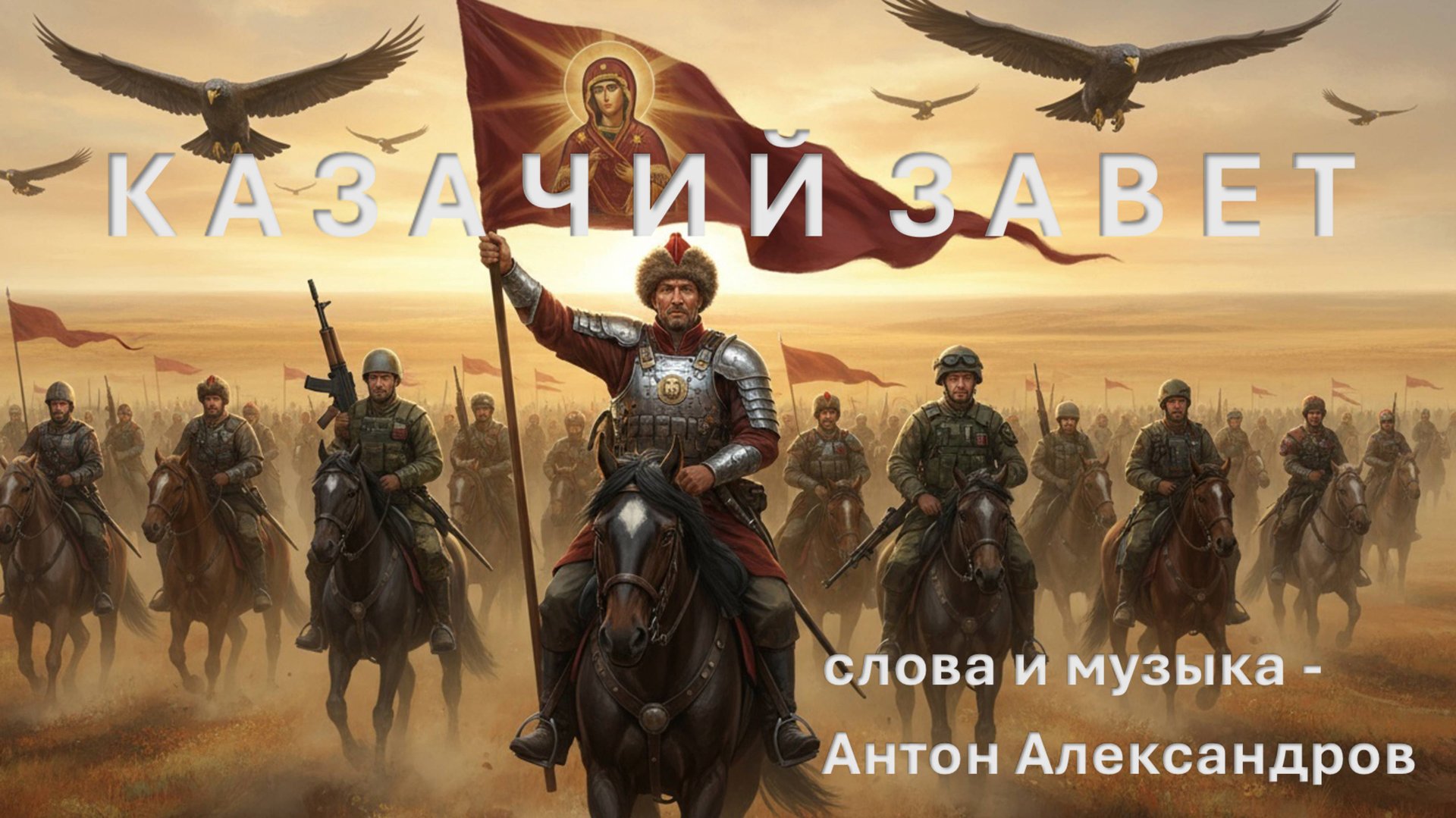Казачий Завет (слова и музыка - Антон Александров) (1) Не ковыль-трава по степи седа, А дорожный прах, да бетон-беда. Не орлы парят над родным бугром — Птички злые здесь со стальным крылом. Тихий Дон молчит, в камышах укрыт, Словно прадедов крепкий сон забыт. И дожди с крестов смыли имена… Позабыли мы, что пришла пора… Что пришла пора да седлать коней, Не железных тех, а живых кровей! Чтоб душа взошла, услыхав тот зов, Что летит к нам с дедовских хуторов! (припев) Пусть летит над степью вольною молва, Что жива в потомках слава Казака! Он написан в душах на тридесять лет — Наш казачий - верный и святой - завет! (2) Помнят берега, как ходили в сечь, Как ложилась в руку казачья речь, Что острей клинка, да прямей стрелы, Как горели в поле зари котлы. Как в чужой земле, под чужой сосной, Находил казак свой покой земной. Только конь хрипел, да звенел булат, Возвращался в курень не каждый брат. Ой, не каждый брат, да не всякий сын... Степь хранит покой их седых могил. Но за каждым павшим — вставала рать, За родной наш Дон жить и умирать!.. (припев) Пусть летит над степью вольною молва, Что жива в потомках слава Казака! Он написан в душах на тридесять лет — Наш казачий - верный и святой - завет! (3) Нынче мы не те, и дела не те, В городской живём душной суете. Но кольнёт порой в самой глубине, Словно дедов шрам на моей спине. И рука сама снимет со стены Шашку, что ковал дед для той войны. Погляжу на сталь, на узорный дол... И пойму, казак, для чего пришёл! Не за звон монет, не за чин пустой — Чтоб горел очаг во степи родной, Чтобы сын мой знал, чей он крови сын, Что казачий род — он на век един! (припев) Пусть летит над степью вольною молва, Что жива в потомках слава Казака! Он написан в душах на тридесять лет — Наш казачий - верный и святой - завет! Он написан в душах на тридесять лет — Наш казачий - верный и святой - завет! Он написан в душах на тридесять лет — Наш казачий - верный… …и святой - завет!..