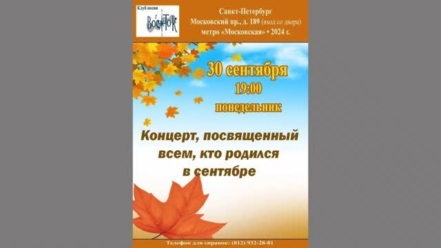Дни рождения сентября. Клуб песни «Восток». 30 сентября 2024 г. Ведущая - Алла Левитан. Видеозапись - Галина Барабохина. Запись звука - Геннадий Демин, Герман Колосов. Афиша - Елена Демьянова-Семененко. Санкт-Петербург, Московский пр., д. 189.