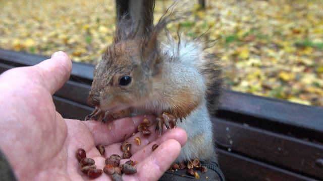 Кормлю мокрую белку под дождём