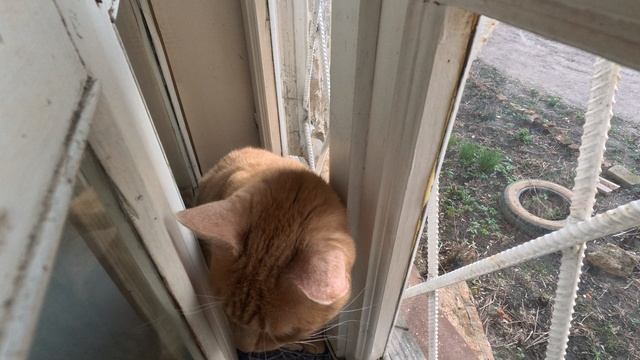 Рыжий кот сидит между окнами
