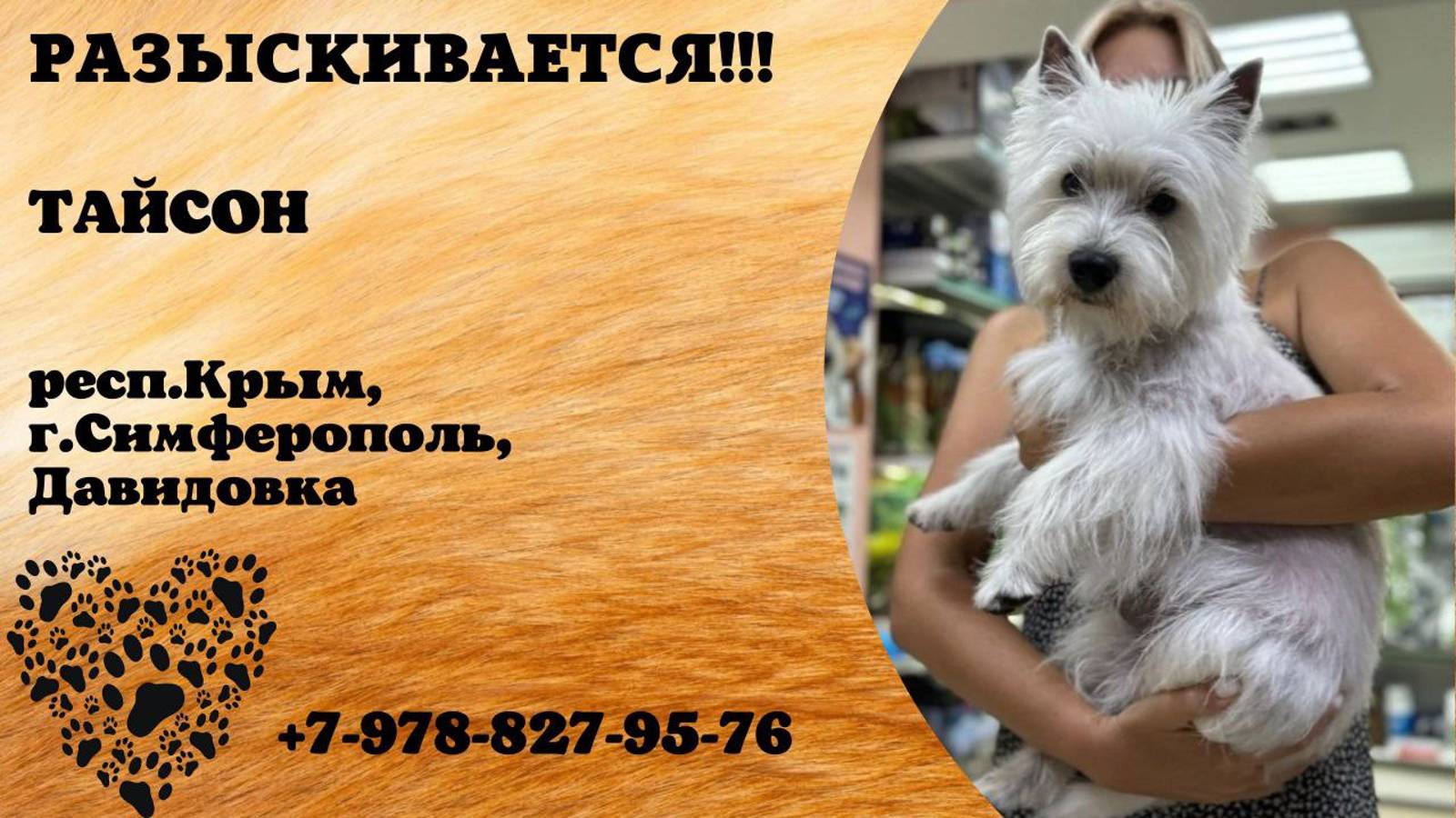 Крым Симферополь Пропала собака 21.09 Мы заплатим 50000₽ за возвращение Тайсон! Пожалуйста помогите найти друга! Симферополь, Давидовка. Замечен на ЖК Крымская Роза, Район Ашана, Москольцо. Может быть уже нде угодно. Таких собак в городе очень мало! Он низкорослый с хвостом «морковкой» Присмотритесь на улице, он может еще скитается, а может его подобрали! Мы будем рады любой информации 89788279576 Инфо: https://vk.com/wall-198815410_154550 Автор: https://vk.com/id2887575