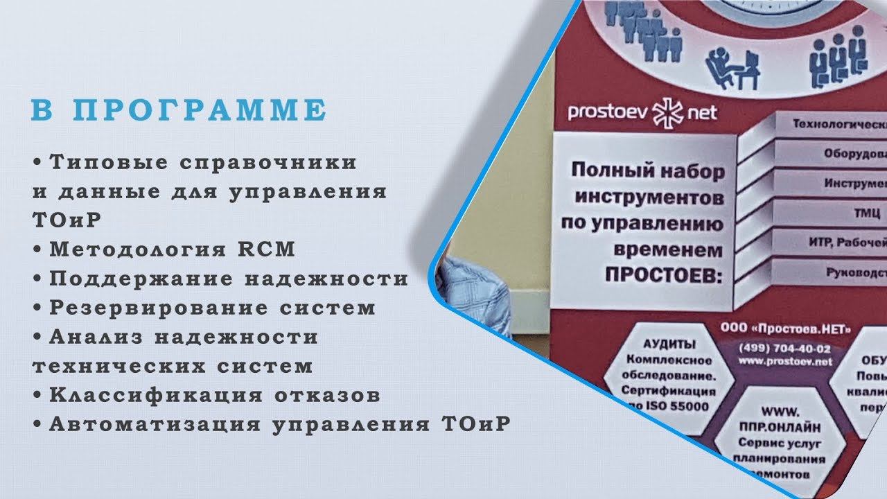 Простоев.НЕТ. Отчет о семинаре. Базовые практики планирования ТОиР. RCM. Сентябрь 2017 г. Мы информационно-образовательный проект по вопросам организации управления процессами поддержания надежности, проведения технического обслуживания и ремонтов технологических систем и оборудования. Подписывайтесь на наш YouTube канал https://www.youtube.com/user/prostoevnet _ Приходите на наш ежемесячный курс «Базовые практики планирования ТОиР, управления надежностью и критичностью оборудования по методике RCM». Подробнее узнать о курсе и зарегистрироваться можно на нашем сайте. _ Курс "Базовые практики планирования ТОиР, управления надежностью и критичностью оборудования по методике RCM" состоит из двух дней, на которых разбираются основы и требования для перехода к планированию с использованием методологии RCM. Типовые справочники и данные для управления ТОиР. Типовые бизнес-процессы для управления ТОиР. Методология RCM. Актуальность по дням 1 день: Основным объектом любой системы ТОиР является оборудование. От качества описания оборудования, его структуры, структуры иерархии, в которой оно работает (производственная система) зависят в конечном итоге решения по выбору стратегии его обслуживания и ремонтов. На больших предприятиях количество отдельных единиц оборудования может составлять сотен тысяч, а иногда миллионов записей. Это означает, что процесс постепенного перехода от бумажных паспортов к четко структурированной логике в описании оборудования требует дополнительной подготовки тех людей, которые будут организовывать и непосредственно проводить эту работу. Данный семинар позволяет структурировать знания об основных подходах к описанию оборудования и начать применять их на практике. 2 день: Понятие «бизнес-процесс» широко используется в практике реорганизации предприятий, подготовке к автоматизации. При этом существует потребность в методической помощи как конкретно описать ту или иную предметную область, насколько детально делать формальное описание и другие конкретные вопросы. На семинаре будут разобраны типовые бизнес-процессы управление ТОиР (около 10), их место в общих процессах управления современным промышленным предприятием. Все процессы будут рассмотрены в специализированной системе бизнес-моделирования Business Studio. Модели не привязаны к конкретным информационным системам и основаны на процессно-ролевом подходе описания предметной области ТОиР. Это позволяет решать не только задачи по автоматизации, но и реализовывать проекты организационных изменений. На семинаре рассматриваются различные подходы планирования ТОиР с учетом надежности и критичности отдельных элементов и целых систем по методике RCM. Документы: Сертификат слушателя курса, все презентационные материалы в эл. виде. Стоимость участия при предоплате- 45 тыс. руб. При оплате по факту или после семинара- 54 тыс. руб. НДС не облагается. Координатор: Ноздрина Оксана, (499) 704-40-02, on@prostoev.net _ Мы в соцсетях: Facebook https://www.facebook.com/www.prostoev... VK https://vk.com/prostoev__net Linkedin https://www.linkedin.com/groups/8464641 Одноклассники https://ok.ru/group/58505577300000 Инстаграм https://www.instagram.com/prostoevnet/ _ http://www.prostoev.net - Информационно-образовательный портал Управления ТОиР #prostoevnet #простоевнет #ТОиР #RCM #управление_надежностью #надежность_оборудования #базовые_практики_тоир