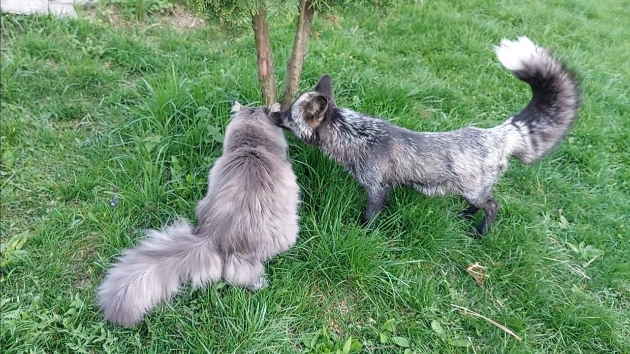 Лиса с котом на травке