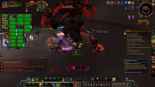 Recorded with XSplit. This quest will become available once you have reach 7000/21000 into the Revered reputation level with the Nightfallen. This quest can be completed using the Looking for Group tool or by entering the Emerald Nightmare with allies (Normal, Heroic, or Mythic difficulty). Queue for the Rift of Aln and defeat Xavius for the first part of this quest. This video was recorded through the Looking for Group tool, so many of the strategies aren't followed exactly as other more established groups may perform this fight. Here are some tips: (1) Corruption builds up over time as you are hit with a few spells throughout the fight; try to move out of circle and away from players being dispelled from particular debuffs like Darkening Soul and Blackening Soul to help reduce the buildup of Corruption, (2) many adds known as Inconceivable Horrors will spawn during this fight; kill them before they reach Xavius, (3) Tank Corruption Horrors near Xavius so AoEs will hit them both, and (4) If you fill your Corruption bar, you will turn into a demon and will become attackable by your fellow raiders. Once you defeat Xavius, you will be teleported to the Emerald Dream, where Cenarius will speak some dialog. Right next to Cenarius, there will be a clickable object named the Purified Life Essence; right-click this to obtain the item, then return to Shal'Aran to complete this quest. Completion of this quest will earn you progress for A Growing Crisis, as required for the Good Suramaritan quest achievement.