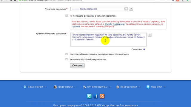 Создание рассылки на смартреспондере. Очень классный инстремент для автоматизации бизнеса, экономии времени и рекрутинга в свою млм компанию. Еще больше полезного материала на моем блоге http://kuhtenkov.com/ По всем вопросам пишите в скайп dimson030878