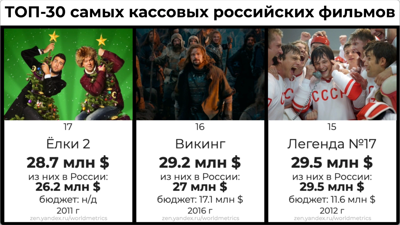 ТОП-30 самых кассовых российских фильмов (сборы в России и мире, а также бюджет)