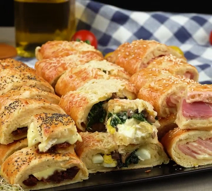 Когда нет времени готовить! Вкусная закуска готова за 10 минут. Ингредиенты: слоеное тесто: 900 г вода: 40 мл слоеное тесто: 900 г яйца : 1 шт. пармезан: 40 г Начинка: окорок: 200 г сыр : 200 г майонез: 40 г яйца : 3 шт. грибы, шампиньоны : 250 г соль: 2 г черный перец: 2 г шпинат: 130 г вяленые помидоры : 200 г сыр Бри: 150 г белый кунжут : 10 г семена мака : 10 г сушеный розмарин: 4 г Music: www.bensound.com Royaty Free Music: https://www.bensound.com License code: R8B3Q6F46SWLKTTS