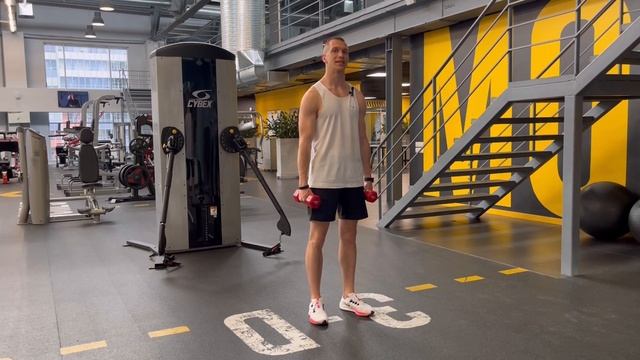 Приседание с выносом гантелей вперёд