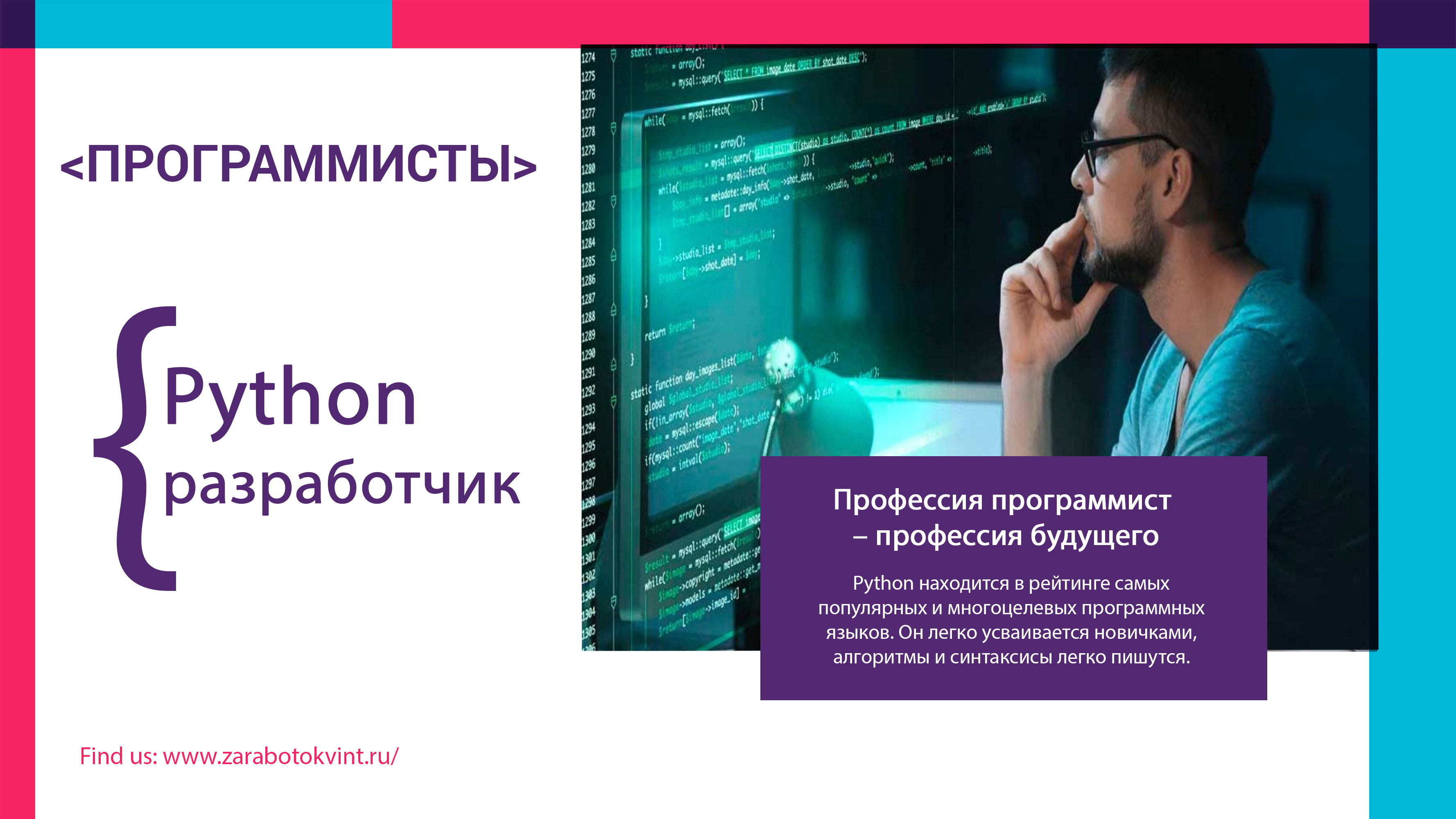 Python-разработчик Python находится в рейтинге самых популярных и многоцелевых программных языков. Больше информации на сайте https://zarabotokvint.ru Он легко усваивается новичками, алгоритмы и синтаксисы легко пишутся. При всём этом язык обеспечивает хорошую производительность. Все плагины и скрипты во многих приложениях создаются разработчиками Python, в том числе некоторые онлайн-сервисы и даже игры. Если вы начинающий программист, но при этом обладаете хорошим складом ума, то профессия отлично подойдёт как для практики, так и для дальнейшей карьеры. В среднем разработчик Python зарабатывает 70 тысяч рублей в месяц. Вам может быть интересно Копирайтинг для начинающих — с чего начать https://zarabotokvint.ru/profi/kopirayting-nachalo Интернет-профессии https://zarabotokvint.ru/profi/internet-professii