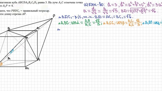 Длина диагонали куба 1111 равна 3. На луче 1 отмечена точка так, что 1 = 4. а) Докажите, что 1 − правильный тетраэдр. б) Найдите длину отрезка .