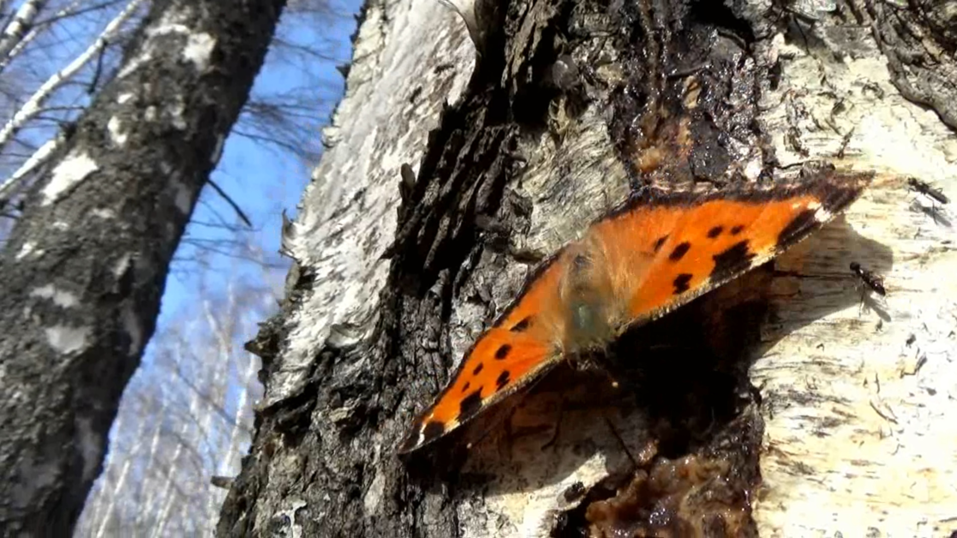 Бабочка пьет березовый сок