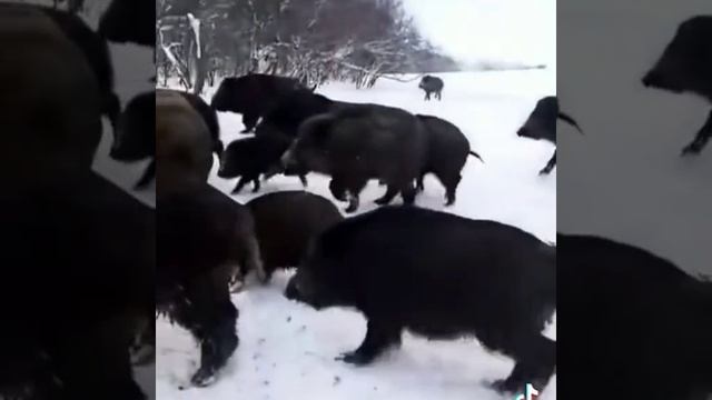 Сдесь показывают голодных кабанов,которых приехал кормить егерь,который не успевает высыпать мешки с кормом кабаны отнимают и сами рвут мешки.
