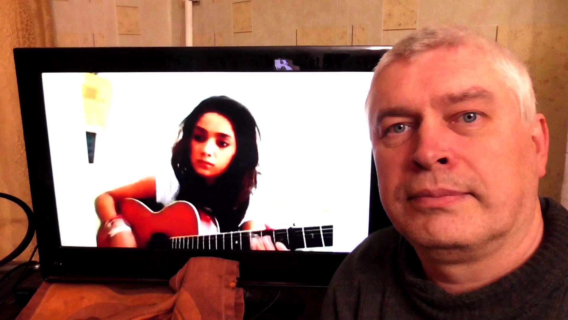 Я слушаю песню по телевизору. Девушка поёт и играет на гитаре