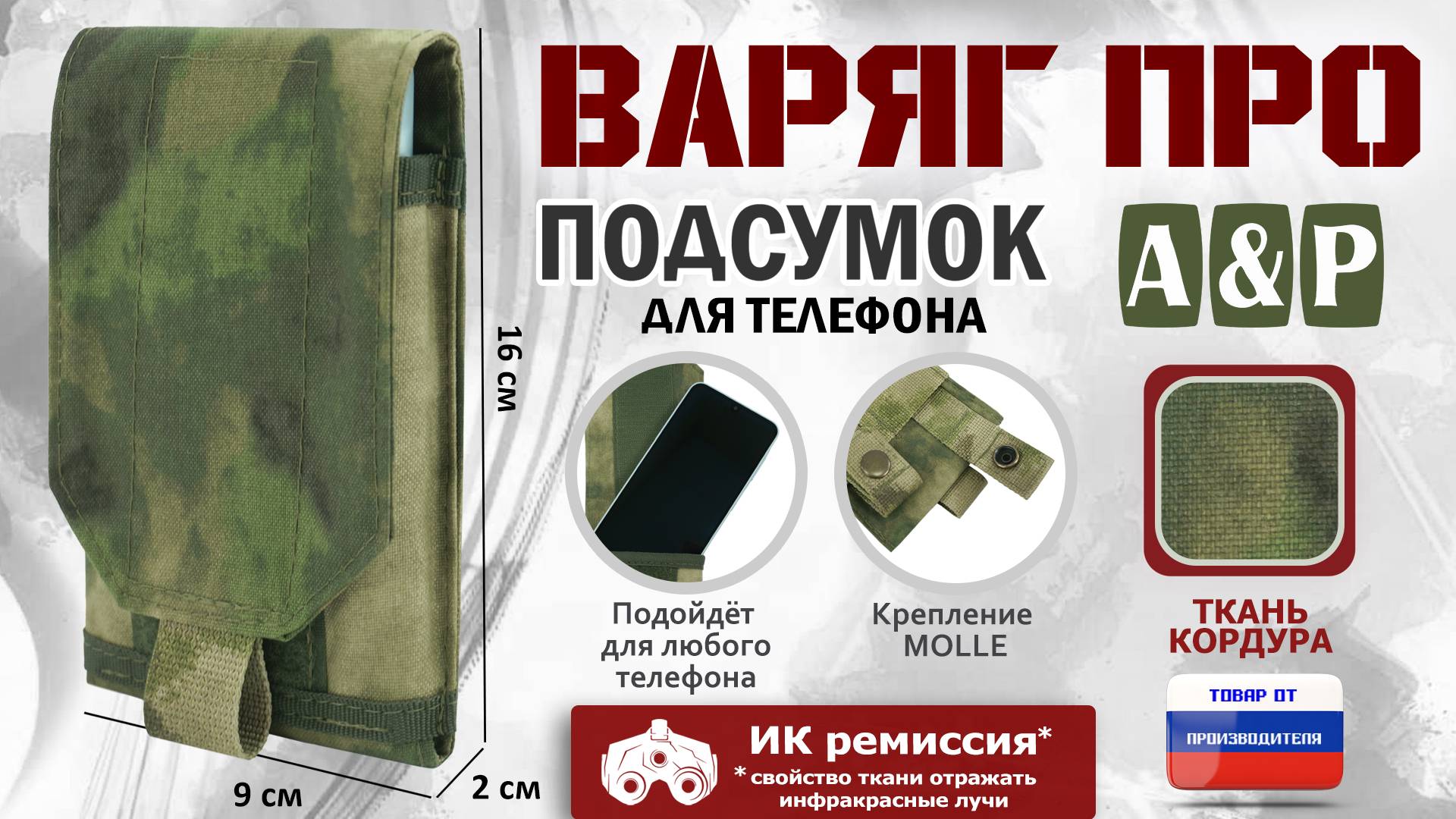 Заказать подсумок тактический для телефона Варяг, а также другие аксессуары можно на официальном сайте компании А&Р Групп: https://ap-group-llc.ru/ Возможность изготовления товаров по индивидуальным размерам и проектам. Гарантия на продукцию 1 год. Доставка осуществляется по всей России, а также в Казахстан и Беларусь. _______________________________________________________________________ Мы ВКонтакте: https://vk.com/apgroup Мы на Wildberries: https://www.wildberries.ru/seller/198927 Мы на Ozon: https://www.ozon.ru/brand/a-p-87358243/ Мы на Я.Маркете: https://market.yandex.ru/business--a-r-grupp-rossiiskii-proizvoditel-aksessuarov/864809