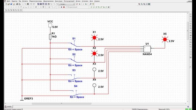 Сегодня мы буем исследовать NAND4 и как работает данная схема, мы разложим все по полочкам. Затем мы переводим переключатель S1 в верхнее по схеме положение, у нас в этом положении переключателя S1 загорается светодиод Х1 и горит светодиод Х5. Переключатель S1 у нас остается в верхнем по схеме положении. Включаем переключатель S2 в верхнее по схеме положение, у нас при этом загорается светодиод Х2 и продолжает светится светодиод Х5. Переключатель S2 у нас остается в верхнем по схеме положении. Переходим на переключатель S3 и включаем его, у нас при этом загорается светодиод Х3 и продолжает светится светодиод Х5. Переключатель S3 у нас остается в верхнем по схеме положении. Переводим переключатель S4 в верхнее по схеме положение у нас горит светодиод Х4, но светодиод Х5 у нас тухнет.