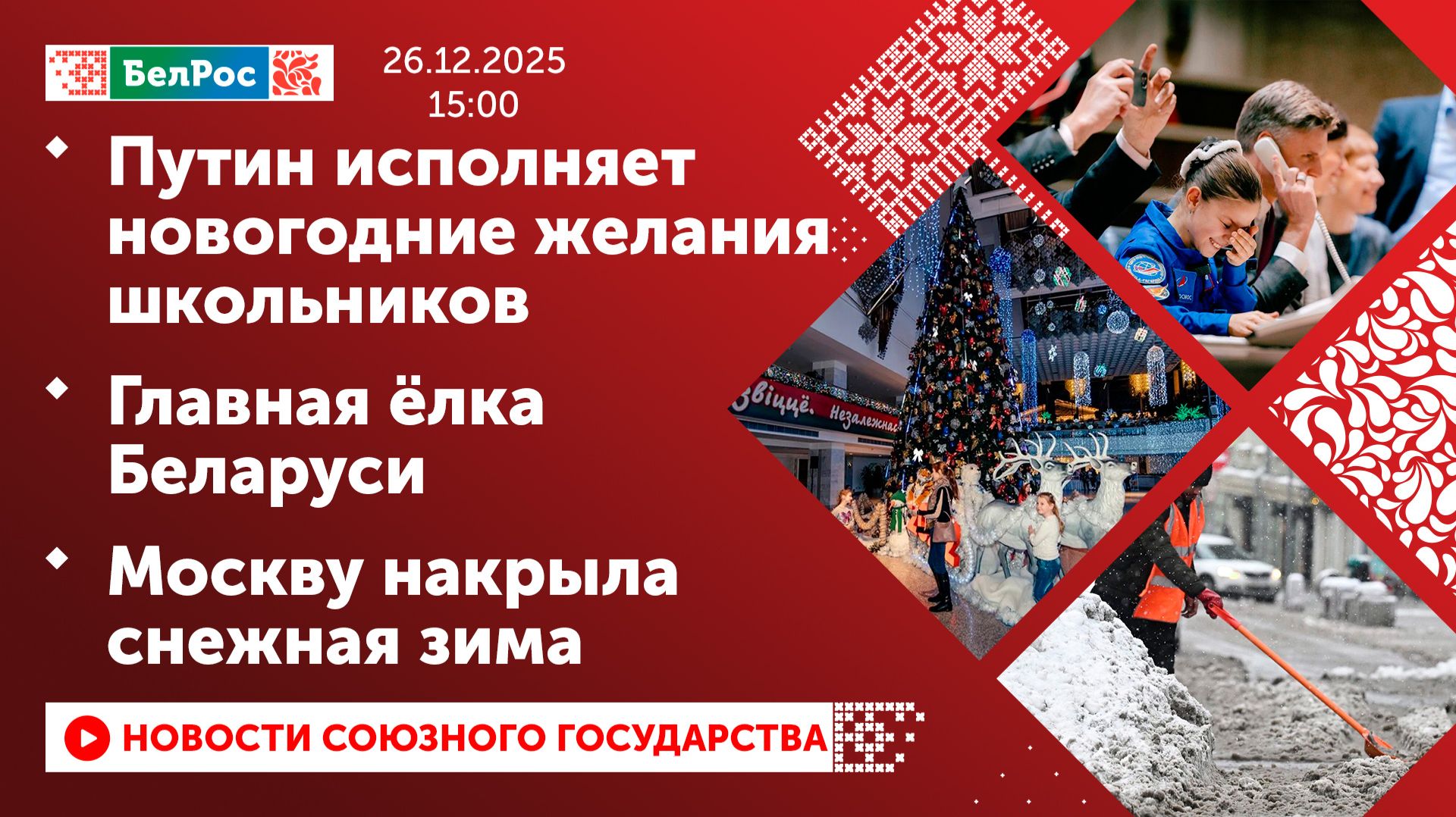 Закадровый текст озвучивает *ИИ Антон* Новости 26.12.2025 на 15:00 - Владимир Путин исполнил желание школьницы посетить Центр подготовки космонавтов. - Владимир Путин исполнил желание школьницы и подарил ей мопса. - Заветные мечты детей исполняют российские политики. - Во Дворце Республики зажглись главная ёлка страны. - В Москве за ночь выпало около трети от месячной нормы осадков. Смотрите главные новости Союзного государства на телеканале БелРос. Ссылки на наши соц. сети Сайт: http://belros.tv/ Telegram: https://t.me/belrostv Одноклассники: https://ok.ru/group/55657426976918 ВКонтакте: https://vk.com/belrostv TikTok: https://www.tiktok.com/@belros_tv?_t=... RuTube: https://rutube.ru/channel/23501830/ Яндекс. Дзен: https://zen.yandex.ru/belrostvv Наши подкасты на Яндекс. Музыке: https://music.yandex.ru/album/25615251 #главныеновости #новостисегодня #СоюзноеГосударство