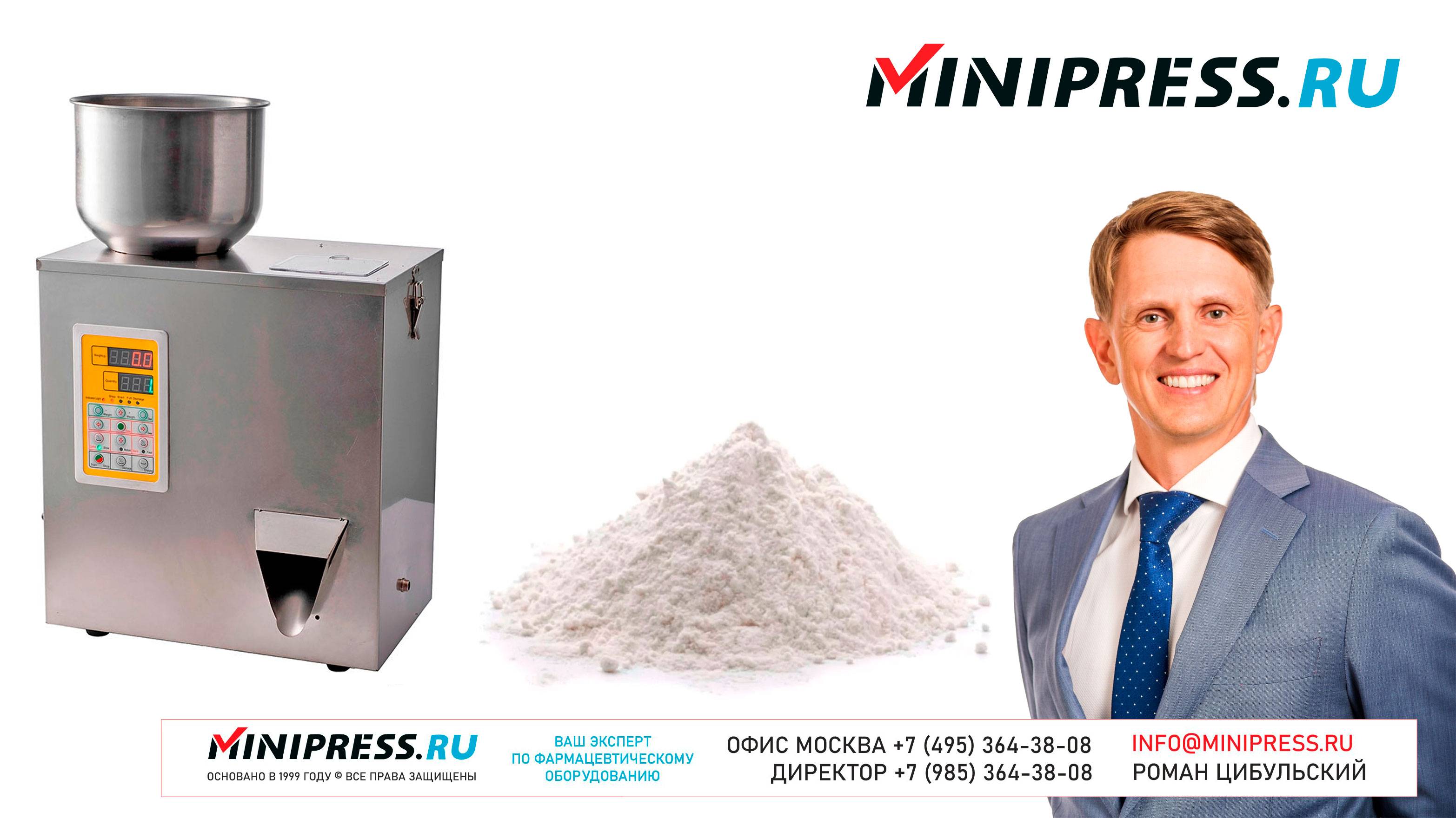 Весовой дозатор вибрационный DG-01 https://Minipress.ru/katalog/ Фармацевтическое оборудование. Специалисты в фармацевтическом оборудовании и технологиях производства лекарств. Более 20 лет оказываем нашим клиентам помощь в выборе, поставке, наладке различного фармацевтического оборудования! Вы в поиске надежного поставщика оборудования? Мы предоставим вам лучший сервис 24/7. Собрана лучшая команда профессионалов в фармацевтической отрасли и налажены стабильные связи с лучшими производителями. Мы не только продаем, но и производим многие модели оборудования Директор компании Минипресс Роман Цибульский Поставка фармацевтического оборудования в Россию Пишите: info@minipress.ru Телефон +7(495)364-38-08; Мобильный +375(29)308-00-00 Россия, Москва Skype: RomanTsibulsky; ICQ: 310-134-490 Подписывайтесь на наш видео канал на Youtube https://youtube.com/user/wwwMinipressru Обновленный сайт https://Minipress.ru Каталог оборудования https://Minipress.ru/katalog/ МЫ В СОЦИАЛЬНЫХ СЕТЯХ G+ https://plus.google.com/+RomanTsibulsky/ FB https://facebook.com/roman.tsibulsky YOUTUBE https://youtube.com/user/wwwMinipressru IN https://ru.linkedin.com/pub/roman-tsibulsky/a6/933/661 БОЛЬШОЙ КАТАЛОГ ФАРМАЦЕВТИЧЕСКОГО ОБОРУДОВАНИЯ https://minipress.ru/katalog/ Постоянно обновляемый каталог различного фармацевтического оборудования с фотографиями, описаниями, видео и ценами. ПЕРСОНАЛЬНЫЙ МЕНЕДЖЕР 24 ЧАСА https://minipress.ru/katalog/ Вы общаетесь по всем вопросам, с момента первой консультации и до получения оборудования, с одним специалистом. СПЕЦИАЛИСТЫ И ТЕХНОЛОГИ https://minipress.ru/katalog/ Имеем обширные связи в фармацевтической среде, найдем любого специалиста, поможем с освоением оборудования и технологий. ОБСУЖДЕНИЕ ВАШИХ ИДЕЙ ПО ПРОИЗВОДСТВУ ПРОДУКЦИИ https://minipress.ru/katalog/ Поможем в оценке ваших идей. Большой опыт в организации различных производств и выпуске продукции. Ценные советы. ФАРМАЦЕВТИЧЕСКОЕ ОБОРУДОВАНИЕ Мы поставили перед собой задачу, помогать нашим клиентам в правильном выборе фармацевтического оборудования. Многолетний опыт подобной деятельности показывает, что многие клиенты сталкиваются, в первую очередь, с непониманием технологического процесса. Покупка оборудования должна быть финальной точкой после подробного обсуждения задачи, консультацией с производителем оборудования, отправкой сырья и материалов на фабрику, тестирования в работе. ДЛЯ ТАБЛЕТОК https://minipress.ru/katalog/category/farmacevticheskoe_oborudovanie/ Смешивание порошков, гранулирование, прессование, обеспыливание, покрытие оболочками, фасовка, упаковка, счет, нанесение логотипов ДЛЯ ЖЕЛАТИНОВЫХ КАПСУЛ https://minipress.ru/katalog/category/farmacevticheskoe_oborudovanie/kapsulyatory-dlya-tverdyh-zhelatinovyh-kapsul/ Фасовка порошков и масел, обеспыливание, счет и фасовка, упаковка, нанесение логотипов. ФАСОВКА И УПАКОВКА https://minipress.ru/katalog/category/upakovochnoe_oborudovanie/ Упаковка в пластиковые и стеклянные флаконы, блистер, фольгу, ламинированную бумагу, стеклянные ампулы, саше, стрипы, тубы, тюбики, контурную ячейку. ТЕХНОЛОГИЧЕСКОЕ https://minipress.ru/katalog/category/eksperimentalnoe-oborudovanie/ Лабораторное, аналитическое, подготовительное, отдельные машины и линии под ключ. СФЕРЫ ДЕЯТЕЛЬНОСТИ Наша компания занимается множеством направлений фармацевтического бизнеса! Предлагаем Вам посетить страницы нашего сайта https://www.Minipress.ru по различным специализациям. ОБОРУДОВАНИЕ ДЛЯ НАКЛЕЙКИ ЭТИКЕТОК НА БУТЫЛКИ АМПУЛЫ ФЛАКОНЫ https://minipress.ru/katalog/oborudovanie-s-otzyvami/oborudovanie-dlya-naklejki-etiketok-na-butylki-ampuly-flakony/ Автоматическое этикетировочное оборудование для этикеток на клеевой основе БЛИСТЕРНЫЕ МАШИН