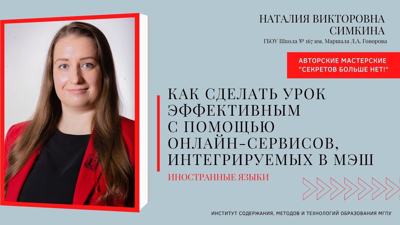 Ведущая мастерской: Симкина Наталия Викторовна, ГБОУ Школа № 167 им. Маршала Л.А. Говорова Тема: "Как сделать урок иностранного языка эффективным с помощью онлайн-сервисов, интегрируемых в МЭШ"