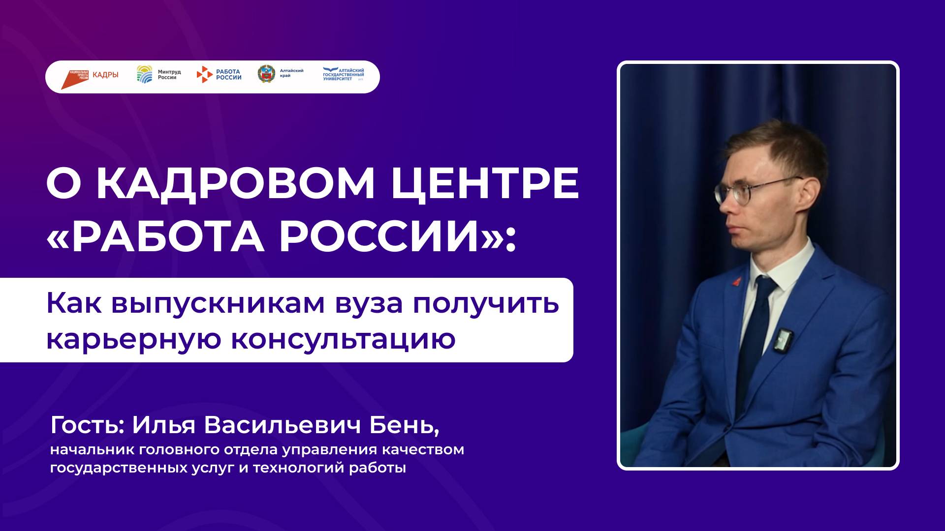 Медиакомьюнити МедиаHub запустило серию интервью с индустриальными партнерами Алтайского государственного университета. Гостем первого выпуска стал Илья Васильевич Бень, начальник головного отдела управления качеством государственных услуг и технологий работы. Илья Васильевич рассказал о кадровом центре «Работа России»: как выпускникам вуза получить карьерную консультацию и найти работу мечты. Смотрите полный выпуск. Будь в Приоритете! Будь с АГУ! Официальный сайт: https://www.asu.ru/ Вконтакте: https://vk.com/altsu_official Одноклассники: https://ok.ru/altsu/ Telegram: https://t.me/asuinfo/ Яндекс Дзен: https://zen.yandex.ru/id/5e72e617b894223da526fae6/ #АГУ #АлтГУ #выпускникивуза #работароссии