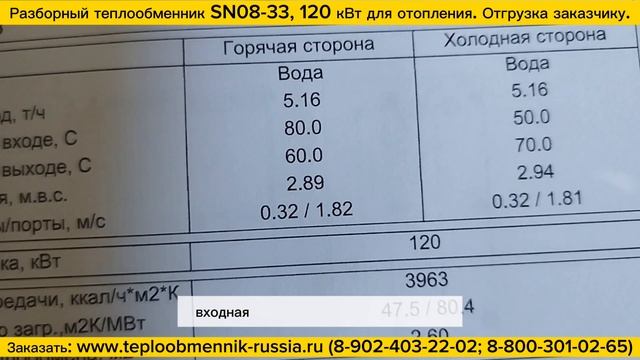 Цена 75 000 руб. (на дату 03.08.2023г.) Пластинчатый разборный теплообменник SN08-33- 120 кВт для системы отопления здания 1200м2. Аппарат обладает следующими характеристиками: 1. Тепловая нагрузка 120 кВт 2. Горячая сторона. Вход: 80С, Выход: 60С 3. Холодная сторона (отопление внутр.) Вход: 50С, Выход: 70С Массовый расход 5,16 т./ч. 4. Патрубки: Ду32 , нар.резьба 5. Поверхность теплообмена (2,6 м2) - 33 пластины ✅ Пластины теплообменника изготовлены из нерж. стали - AISI316 ✅ Высокие рабочие характеристики: макс. рабочее давление - 16 бар., макс. рабочая температура - 150С. ✅ Гарантия 3 Года ✅ Разборная конструкция позволяет легко промывать и обслуживать теплообменник. Мы производим пластинчатые теплообменники с 2009 года, поэтому можем предложить вам лучшие условия: ? - Предложим цену на 30% ниже рынка! ??️ - Изготовим ваш теплообменник за 1 день! ? - Надежно упакуем и доставим оборудование на ваш объект! ?? - Доставим теплообменник в любую точку России! ? - Расчет теплообменников ведется в сертифицированной программе расчета. Подберем на любую мощность и посчитаем за 15 минут! ? - Постоянная сервисная поддержка!