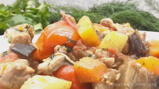 Готовим курицу в овощном рагу. Блюдо получается очень вкусным. Овощи не развариваются сохраняя свою структуру.******************Ингредиенты:Мясо курицы - 800 гр.Лук - 4-5 шт.Морковь - 2 шт.Баклажан - 1 шт.Кабачки - 2 шт.Сладкий перец - 1 шт.Помидоры - 2 шт.Чеснок - 4 зубчикаЗелень по желаниюСоль и перец по вкусуСпеции "итальянские травы" - 1 ч. ложкаМасло растительное - 100 мл.Приготовление:Все ингредиенты нарезаются крупными кусочками.1. Нарезаем лук, обжариваем до мягкого состояния. 2. Нарезаем мясо и добавляем к луку. Обжариваем с мясом на сильном огне 3 минуты. 3. Солим, перчим, добавляем специи и тушим 5 минут на среднем огне.4. Нарезаем баклажаны, кабачки, сладкий перец, морковь и помидоры.5. Добавляем морковь, баклажан, сладкий перец, кабачки и помидоры. 6. Немножко солим и перчим. Накрываем крышкой, убавляем огонь и готовим 30 минут.7. Нарежем мелко чеснок и зелень.8. Прошло 30 минут. Наше блюдо готово. Добавляем чеснок и зелень. Все перемешиваем и можно подавать на стол.Приятного аппетита.***********************Дорогие друзья, если вам понравилось это видео, вы можете помочь развитию канала:Оцените видео! ? - Мне будет приятно, и это поможет развитию канала.Оставьте комментарий или задайте вопрос по рецепту. Я буду рад ответить вам.? Делитесь этим видео с друзьями в социальных сетях, если оно Вам понравилось, это поможет продвижению канала.Подписывайтесь на канал, нажимайте колокольчик, чтобы не пропустить новый ролик с быстрыми и вкусными рецептами.Спасибо за ваше время!Мы в соцсетях:https://www.instagram.com/parovarim/https://www.tiktok.com/@parovarim?zen.yandex.ru/id/6079831f43979574b8ab6e90Подписывайтесь на любимые рецепты:https://www.youtube.com/channel/UCARLmqcBD5JJa6tSRhnlU8w#Тушенаякурица #Курицасовощами # Пароварим