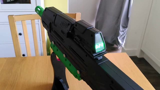 Here's a quick look at my latest isolation project: a modified Nerf MA40 Assault Rifle from Halo Infinite. The first thing you'll notice is the paint job which is heavily based on the Monster Energy promotional coating (https://www.windowscentral.com/sites/wpcentral.com/files/styles/xlarge/public/field/image/2020/10/halo-infinite-assault-rifle-adrenal-skin.png) It's not quite an exact match, I took some liberties to make the spray job much easier. Cos I'm lazy, deal with it. I might hand paint in some more green detail later. You'll also see the ammo counter now lights up in a matching green. I don't have 8.28 shots, that's actually a voltmeter. There are nerf MA40 mods with a working counter (btw that new Alien pulse rifle looks dope) but those were made by people much more competent than me. Plus the voltmeter does serve an important purpose... ... the battery upgrade! It now runs on a 2S LiPo battery. These things get a bit fiddly if kept at voltages too high or too low for too long, hence the voltmeter. This powers the two upgraded meishel motors, resulting in a good bit of power behind the shots for blatting my housemate when he comes home. The electric internals come from this kit (I'm from the UK, deal with it) https://www.uknerfwar.com/product-page/stryfe-starter-kit along with a couple of extras from that site to make the voltmeter work.