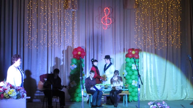MVI 6181 Юбилейный концерт Людмилы Поповой. Театр поздравляет, песню напевает, на гитаре играет, ширинкою (шалью, ст. рус. слово) машет...