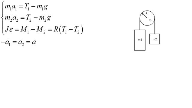 Решена задачка о аналоге падения лифта. Две гири с массами m1 и m2 соединены нитью, перекинутой через блок массой m. Найти ускорение a, с которым движутся гири, и силы натяжения нитей T1, T2, к которым подвешены гири. Блок считаем однородным диском. Трением пренебрегаем (проскальзыванием тоже).