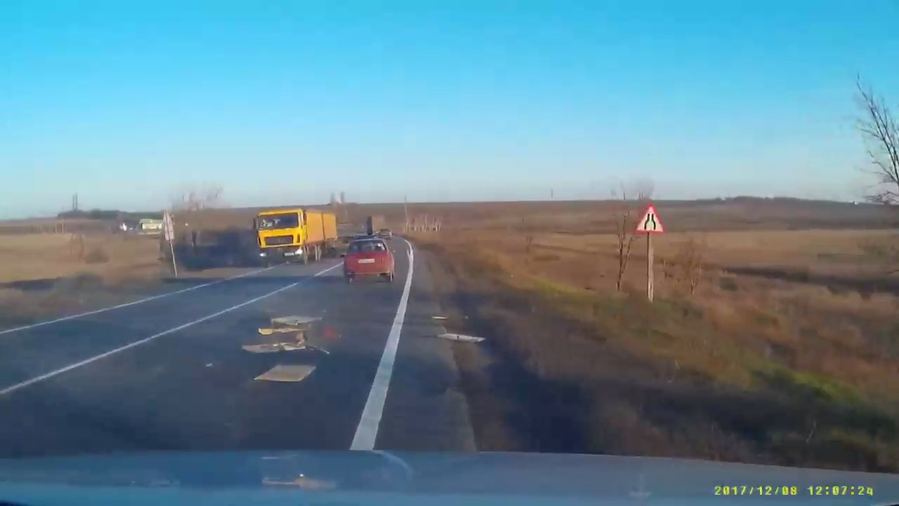 Трасса Одесса - Николаев. Комментарий автора: "Водитель Лада 2109 с прицепом груженный хламом*(мебелью) - теряет плохо закрепленную тумбочку-которая попадает под колеса сюбару и таврии. Сюбару пытаясь предотвратить удар об препятствии не справляется с управление и цепляет прицеп фуры движущейся встречном направлении. Итог морда разбита у сюбару, у Таврии фара. Слава богу что сюбару не попала боком под фуру-была бы беда-в машине находились 4 человека" #авария #крепление #мебель