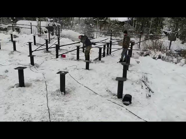 Монтаж фундамента на винтовых сваях по проекту 1197. Под деревянный сруб необходимо и достаточно установить около 18-25 свай диаметра 108 или 133 в зависимости от расчетной нагрузки на сваю и расчетного веса дома. Установка винтовых свай производится как ручным, так и механическим способом с использованием путем завинчивания оголовка в землю. Перед расчетом свайного поля необходим выезд специалистов для пробного завинчивания сваи. По результатам завинчивания и обледования участка и данных проектной документации будет принято решение о длине, диаметру и количеству винтовых свай. Наша компания выполняет следующие виды фундаментов для деревянного дома: на винтовых сваях, мелкозаглубленный ленточный армированный монолитный фундамент, монолит-плита.