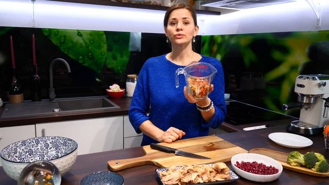 Рецепт: Вареное куриное мясо (2 окорочка куриных) Гранат 1 шт Брокколи зеленые соцветия 50 гр Грецкий орех 100 гр Майонез 1-2 ложки Соль и перец