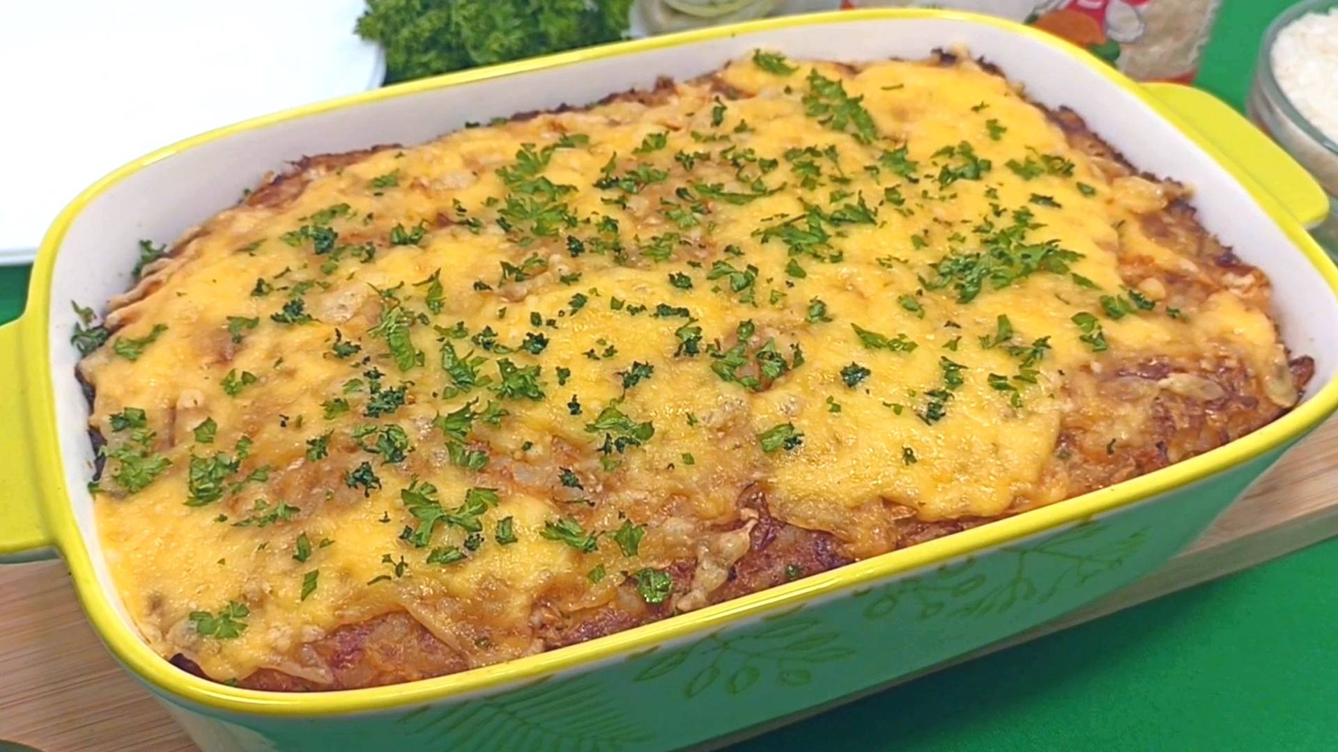 Здравствуйте дорогие друзья! Сегодня мы с вами приготовим очень вкусную и нежную капустную запеканку с фаршем и рисом. Готовим очень вкусную и нежную капустную запеканку с фаршем и рисом. Время приготовления: 1 час. Ингредиенты: 300 мл воды, 300 г белокочанной капусты, 300 г мясного фарша, 100 г круглозерного риса ТМ «Алейка», 100 г любимого твердого сыра, 4 ст. ложки натурального подсолнечного масла ТМ «Алейка», от щедрых полей Алтая, 2 ст. ложки сметаны, 2 яйца, 1 луковица, 1 ч. ложка соли, 1/4 ч. ложки черного молотого перца, зелень петрушки по вкусу. Приготовление: 1. 300 грамм белокочанной капусты очистить от верхних листьев и срезать кочерыжку. Капусту нашинковать. 2. Луковицу очистить и мелко нашинковать. 3. 100 грамм любимого твердого сыра натереть на крупной терке. 4. На сковороде разогреть 3 столовые ложки натурального подсолнечного масла ТМ «Алейка». 5. Выложить нашинкованный лук и обжарить, помешивая, 2-3 минуты. Обжаренный лук остудить. 6. В сотейник отмерить 100 грамм круглозерного риса ТМ «Алейка». Влить 300 миллилитров воды и варить 7-10 минут после закипания до полу готовности. 7. Нашинкованную капусту переложить в большую миску добавить1 чайную ложку соли и хорошо помять руками. 8. Рис промыть и откинуть на сито. Дать воде полностью стечь. Рис остудить. 9. Добавить к капусте 300 грамм мясного фарша, 2 яйца, обжаренный лук, рис, 2 столовые ложки сметаны, 1/4 чайной ложки черного молотого перца. Хорошо перемешать. 10. В форму для запекания добавить 1 столовую ложку натурального подсолнечного масла ТМ «Алейка» и кисточкой хорошо смазать дно и края формы. 11. Выложить массу для запеканки в форму и разровнять. 12. Запекать в разогретой до 180 градусов Цельсия духовке 30 минут. 13. Достать запеканку из духовки и посыпать тертым сыром. 14. Вернуть запеканку в духовку еще на 10 минут. 15. Вынуть из духовки и немного остудить. Украсить зеленью петрушки. 16. Капустная запеканка с фаршем и рисом готова. Можно подавать к столу. Приятного аппетита!