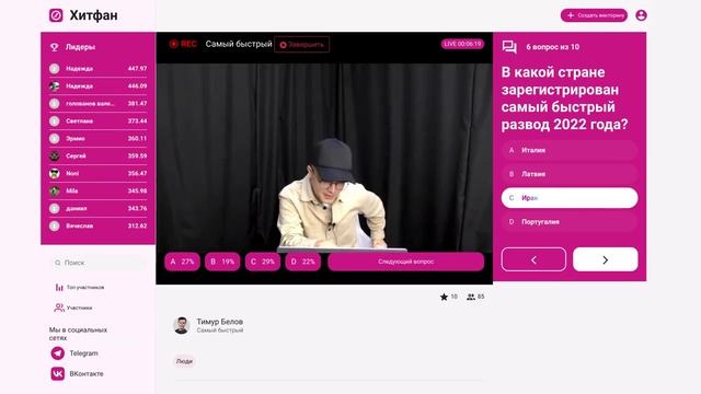 Викторина платформы интерактивных викторин ХитФан с ведущим DFM Тимуром Беловым от 9 ноября