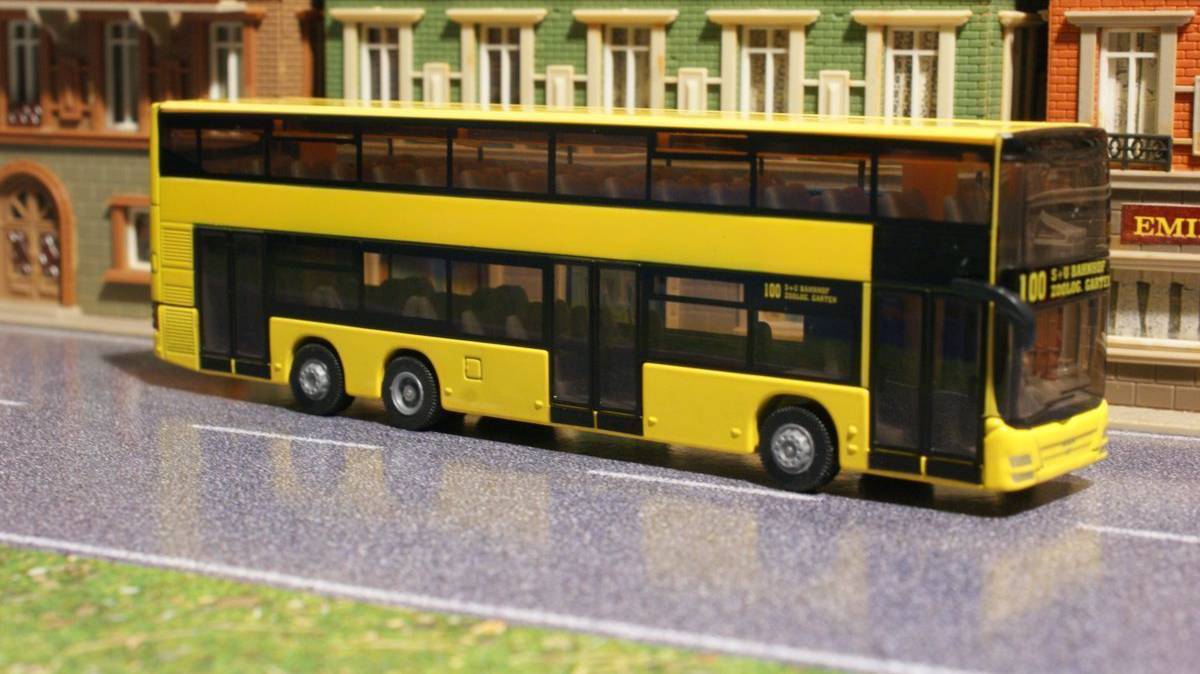 Игрушечная модель городской двухэтажный автобус MAN, корпус выполнен из металла, стёкла из прозрачной тонированной пластмассы, колёса выполнены из резины и вращаются, можно катать.