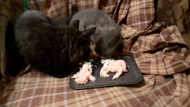 Котята Миша и Тиша завтракают, сначала творожный сыр пошёл на ура и на второе фаршик куриный, приятного аппетита и всех с добрым утром, удачи.