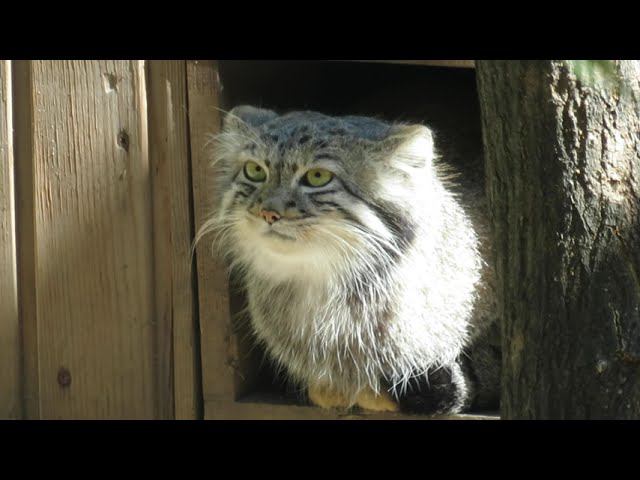 Манул Снежинка редко выходит из своей будочки 07.08.2023