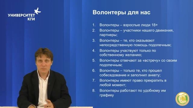 Содержание вебинара: - Как устроено Добровольческое движение «Даниловцы»? - Что такое социальное волонтёрство? - Где работает Добровольческое движение «Даниловцы»? - Что делают волонтёры движения «Даниловцы»? - Какова наша миссия? Каковы наши цели и задачи? - Наши волонтёрские принципы. - Наша организационная модель-схема. - Основы и базовые принципы нашей огранизационной модели. - Кто наши волонтёры: с кем мы работаем и кто они для нас? - Наша организационная модель: управляющая команда и сотрудник. - Координаторы волонтёрских групп. - Что такое волонтёрская группа и как организована ее работа? - Как привлекать волонтёров? Каковы принципы и правила их работы? - Как организована подготовка и обучение волонтёров? - Зачем нужна помощь и поддержка волонтёров и как это реализовано в «Даниловцах»? - Откуда «Даниловцы» берут координаторов, как их готовят, как перезапускают волонтёрские группы? - Как организована система супервизии и поддержки координаторов. - Путь волонтёра в Добровольческом движении «Даниловцы». - Каналы коммуникации с волонтёрами в Добровольческом движении «Даниловцы». Обучающий вебинар в Университете Комитета гражданских инициатив. Ведущий: Юрий Белановский - руководитель Добровольческого движения «Даниловцы» http://www.danilovcy.ru/, руководитель «Школы социального волонтерства» http://volonter-school.ru/ Обучающий вебинар в Университете Комитета гражданских инициатив. Ведущий: Юрий Белановский- р уководитель Добровольческого движения «Даниловцы» http://www.danilovcy.ru/, руководитель «Школы социального волонтерства» http://volonter-school.ru/