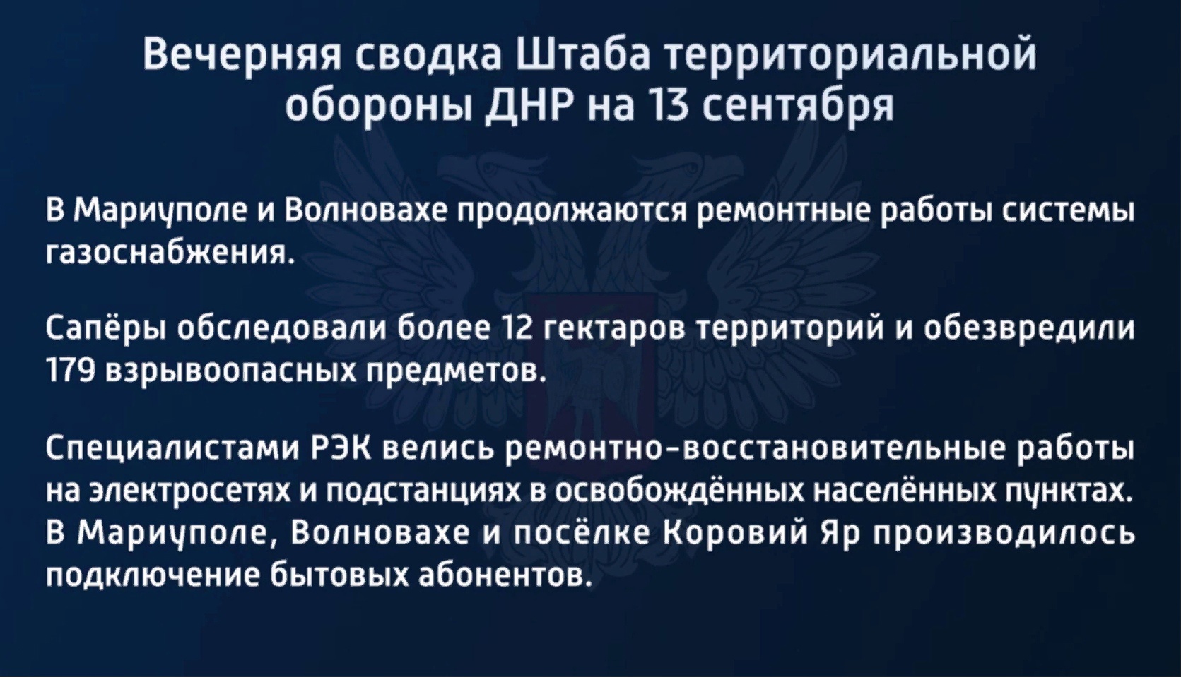 Вечерняя сводка Штаба территориальной обороны ДНР на 13 сентября 2022 года